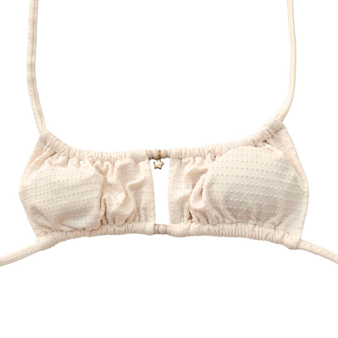 Top Chanilly - Estilo cortininha super diferente, esse é o nosso top Chantilly! Ele possui elásticos especiais na medida certa para o biquíni não sair do lugar, além de garantir total conforto. Ele tem decote com miçangas e pingente, super lindo! Esse modelo possui bojo molinho e confortável.
