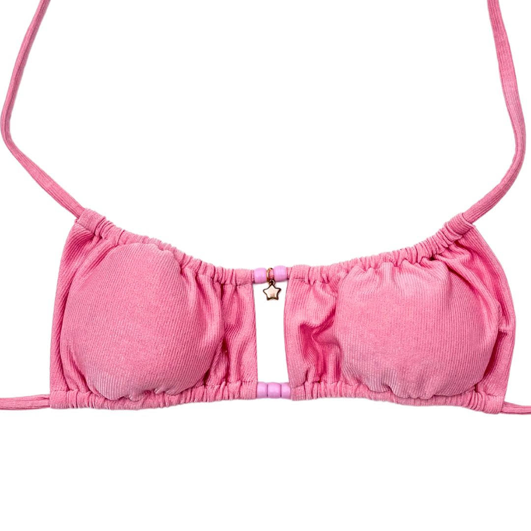 Top Chanilly - Estilo cortininha super diferente, esse é o nosso top Chantilly! Ele possui elásticos especiais na medida certa para o biquíni não sair do lugar, além de garantir total conforto. Ele tem decote com miçangas e pingente, super lindo! Esse modelo possui bojo molinho e confortável.