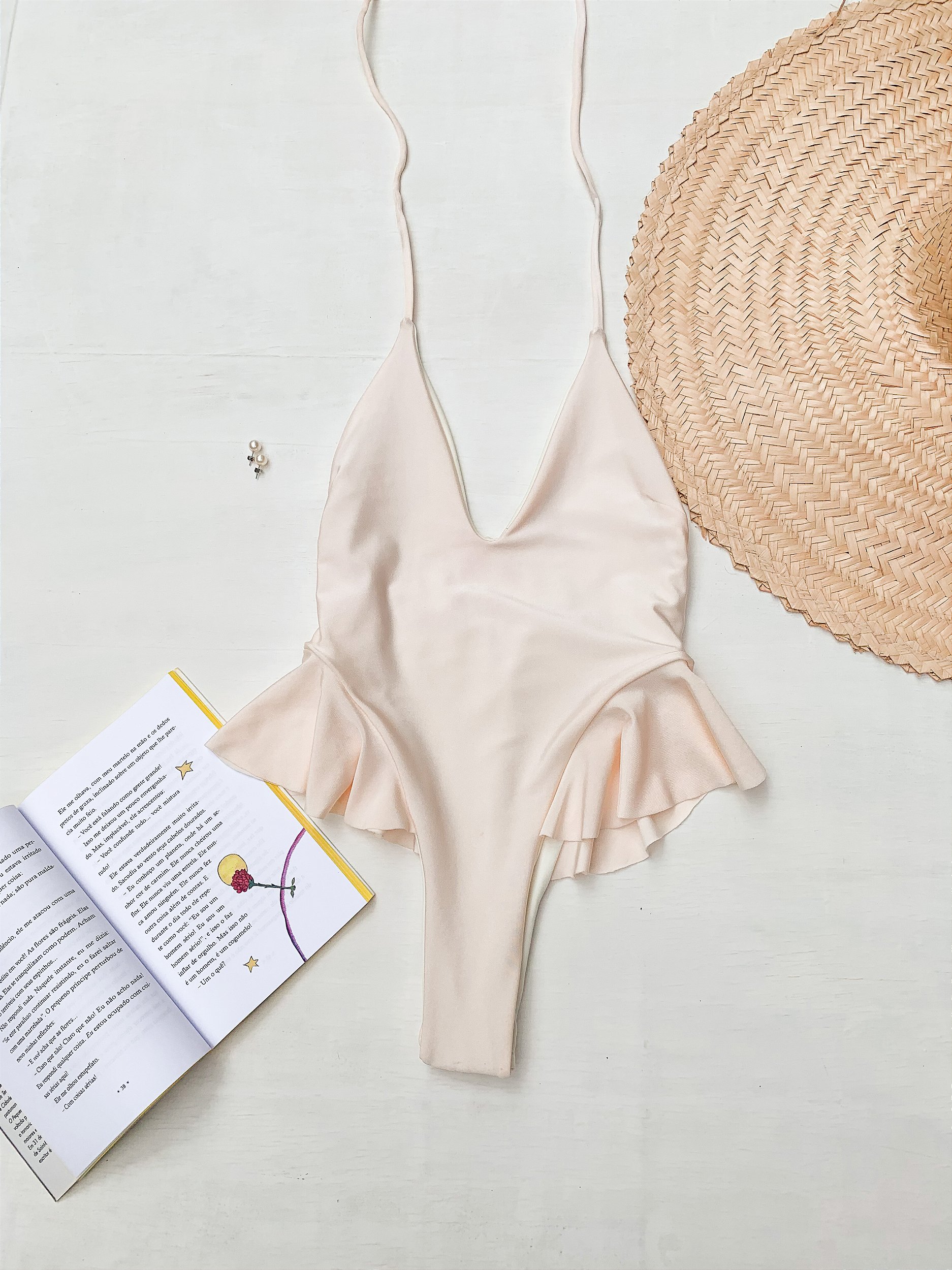 Maio Jujuba – Super ousado e diferente, nosso maiô jujuba tem modelagem exclusiva com babados nas laterais, além de ser bem cavado e decotado. Possui pences para melhor ajuste ao busto e possui alças com amarração no pescoço com elásticos especiais na medida certa para o maiô não sair do lugar, além de garantir total conforto (ninguém merece aquelas alças que ficam machucando, né?). Possui recorte no bumbum para o encaixe perfeito.