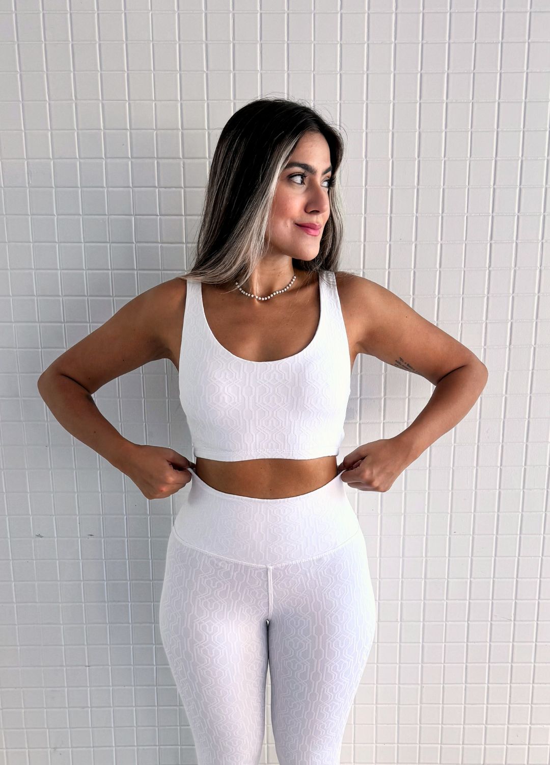 Tecido White - Lycra branca com textura geomátrica. Possui altíssima elasticidade e toque bem confortável no corpo.